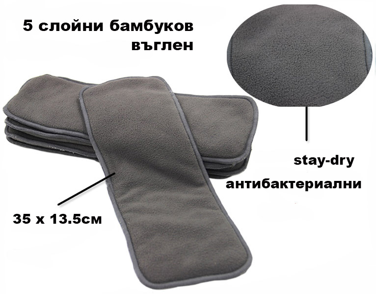 - Изключително абсорбиращи 5-слойни бамбукови подложки с активен въглен и микрофибър.